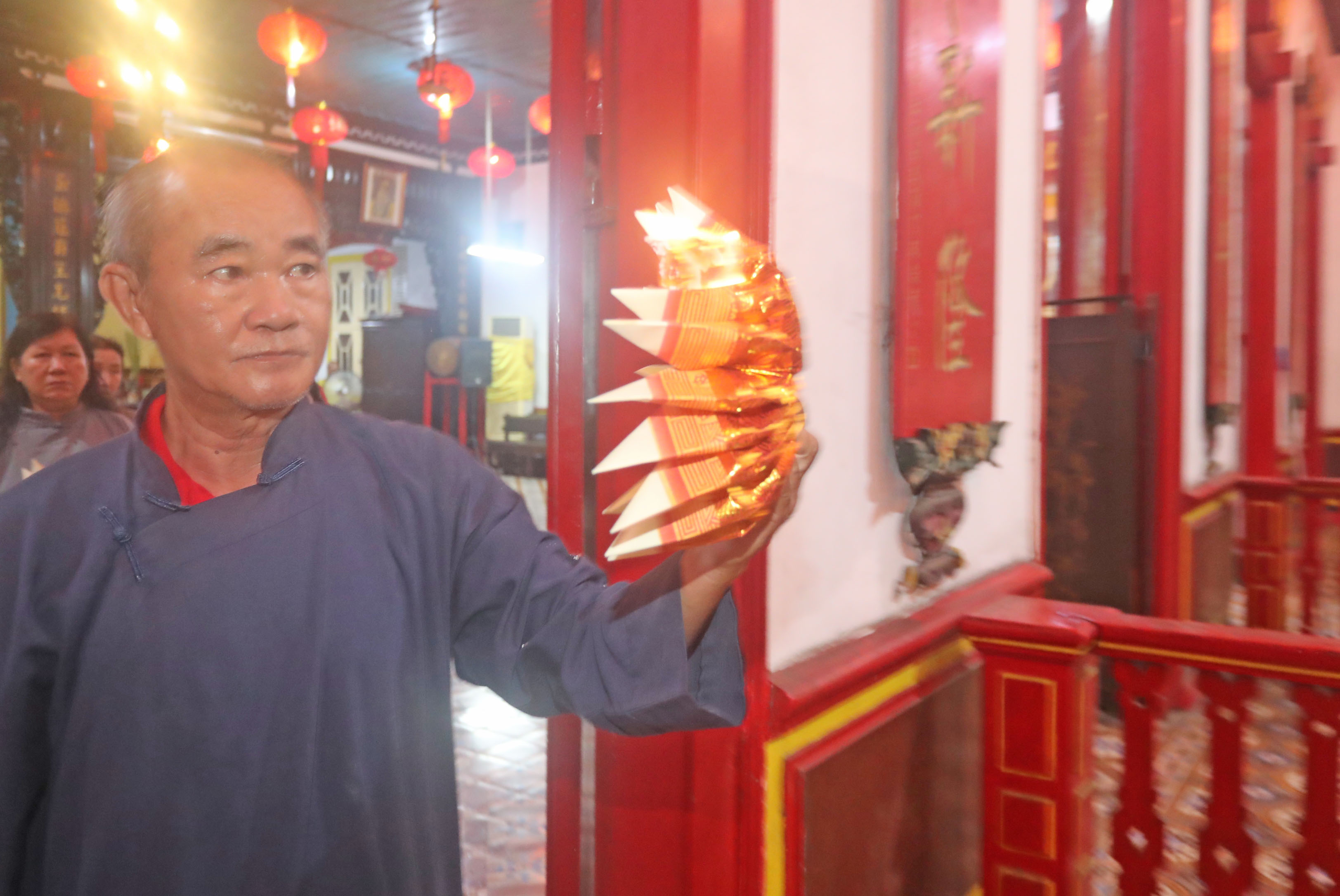 Pemimpin ibadah cisuak Xs. Liem Tiong Yang membakar kertas thi kong kim dalam ibadah cisuak di Kelenteng Boen Bio Surabaya, 10 Februari 2025.-Boy Slamet-Harian Disway