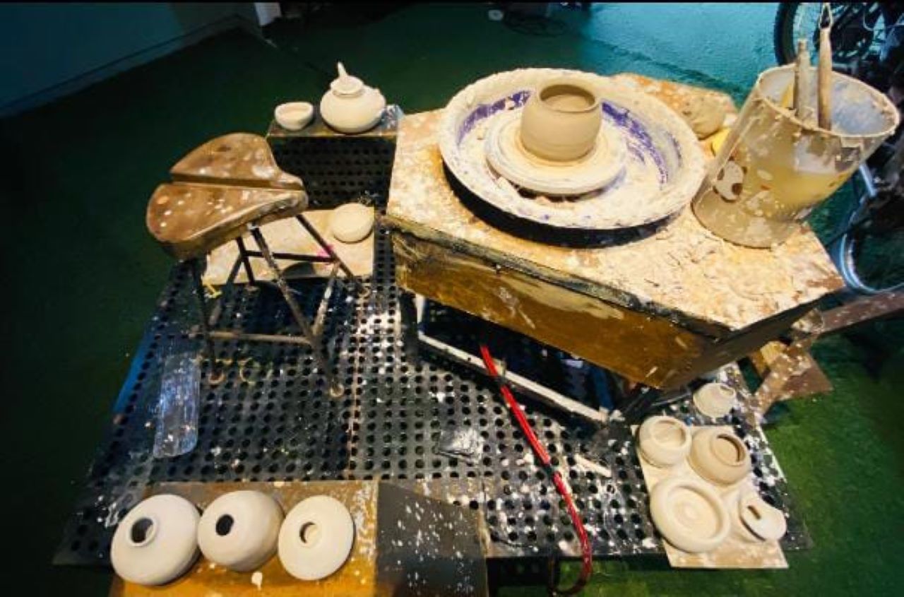 Setelah itu, Londho mengajak Dini dan peserta lainnya ke meja putar. Ia mengajarkan trik untuk berkarya dengan meja putar. Para peserta dipersilakan mencoba menginjak pedal untuk memutar meja.