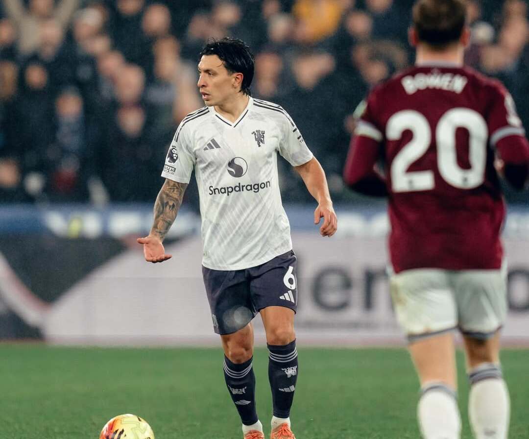 Momen bek Manchester United, Lisandro Martinez, ketika berusaha membangun serangan dalam laga kontra West Ham United. Rabu, 11 Februari 2026.--instagram @manutd