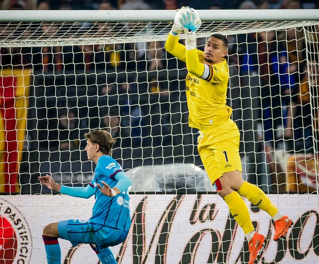 Momen kiper Cagliari, Elia Caprile, ketika melakukan penyelamatan dalam laga kontra AS Roma.--Instagram @eliacaprile