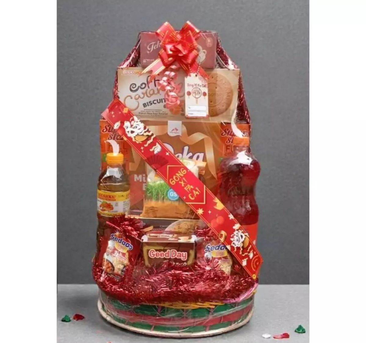 Hampers sembako tetap menjadi pilihan praktis dan bermanfaat. Isi parcel dapat berupa minyak goreng, gula, sirup, mi premium, atau saus tiram yang dikemas dalam kotak atau keranjang eksklusif.
