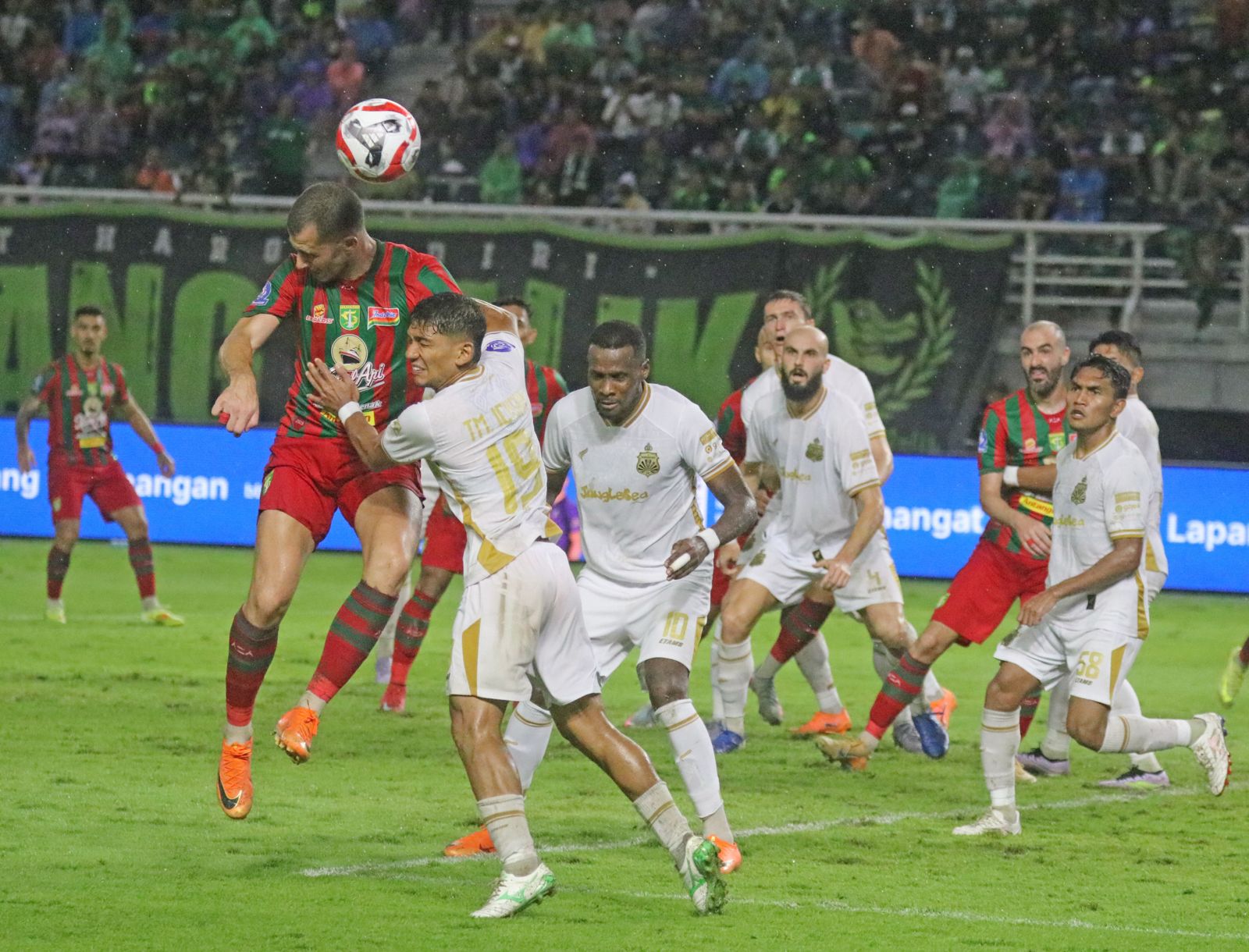 Mihailo Perovic (kiri) menciptakan peluang lewat tandukannya saat Persebaya kalah 1-2 melawan Bhayangkara Presisi Lampung FC, Sabtu, 14 Februari 2026.-Boy Slamet-Harian Disway