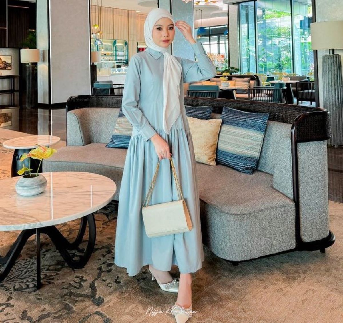 Dress sederhana dengan potongan clean akan terlihat anggun tanpa usaha berlebih. Warna pastel atau cokelat muda cocok untuk suasana Ramadan yang hangat.