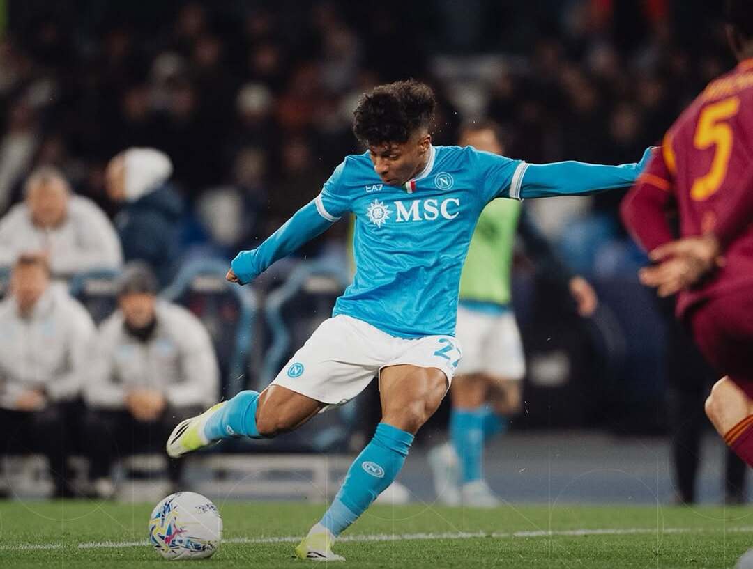Momen penyerang muda Napoli, Alisson Santos, ketika mencetak gol dalam laga kontra AS Roma. Senin, 16 Februari 2026.--instagram @officialsscnapoli