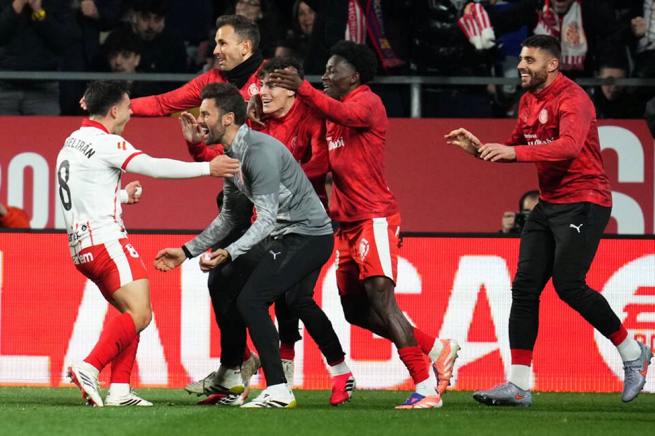 Selebrasi Fran Beltran usai buat Girona remontada atas Barcelona jelang akhir laga dalam lanjutan La Liga 2025/2026 jornada ke-24, Selasa 17 Februari 2026--Getty Images