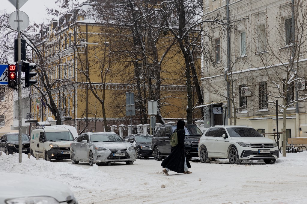 Warga melintas di salah satu sudut Kota Kyiv, Ukraina di tahun kelima perang Rusia-Ukraina-Tetiana Dzhafarova/AFP-