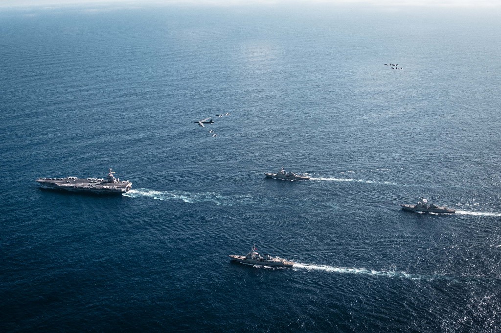 Gugus Tempur USS Gerald R. Ford saat berlayar di Laut Karibia. Kini kapal induk terbesar AS ini diperintahkan untuk bergerak ke timur tengah memperkuat saudarinya, USS Abraham Lincoln-US Navy/Getty Images via AFP -