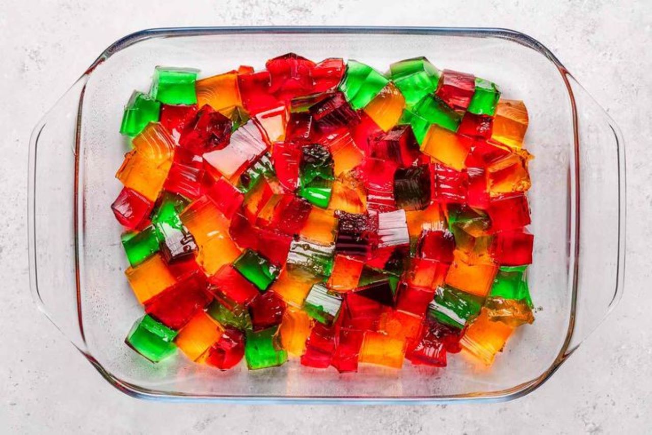 Satukan potongan-potongan dadu jeli tersebut. Maka, tampilannya jadi menarik. Warna-warni jeli akan membuat es jeli susu terlihat lebih menggoda.