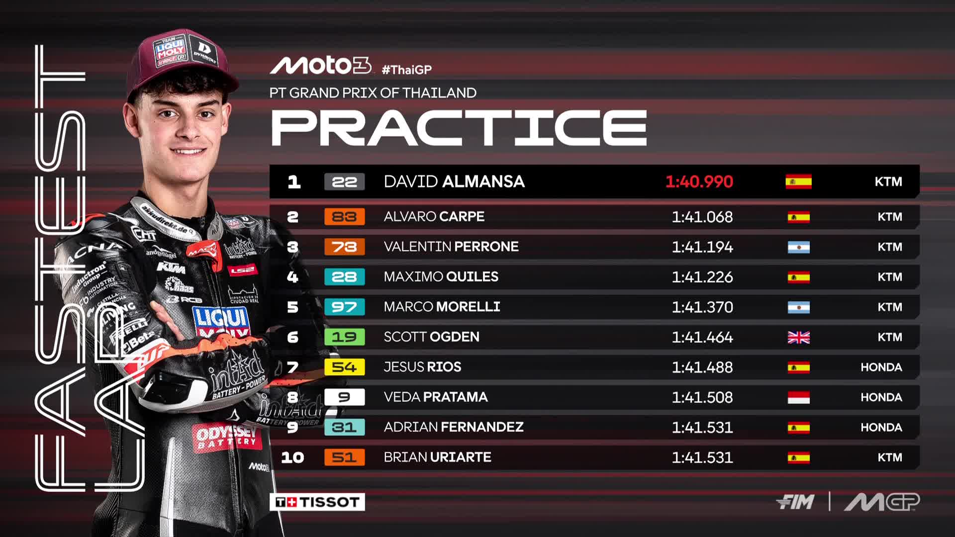 Catatan waktu terbaiknya mencapai 1 menit 41,508 detik. Hanya terpaut +0,518 detik dari pembalap tercepat, David Almansa, yang mencatatkan 1 menit 40,990 detik.