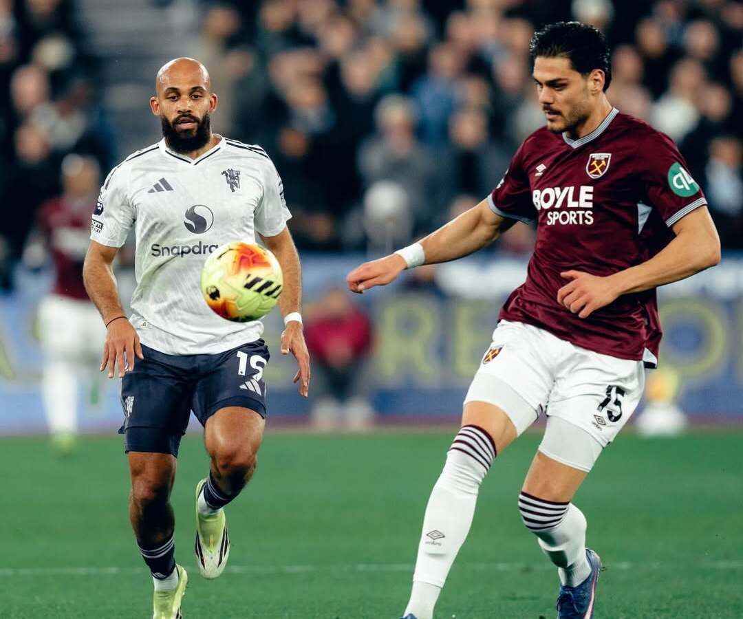Aksi penyerang Manchester United, Bryan Mbeumo (kiri), ketika ingin merebut bola dari bek West Ham United, Konstantinos Mavropanos. Rabu, 11 Februari 2026.--instagram @manutd