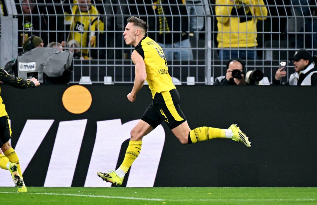 Selebrasi Nico Schlotterbeck usai buka keunggulan bagi Dortmund atas Bayern Munchen dalam laga Bundesliga 2025/2026 pekan ke-24, Minggu 1 Maret 2026--IMAGO