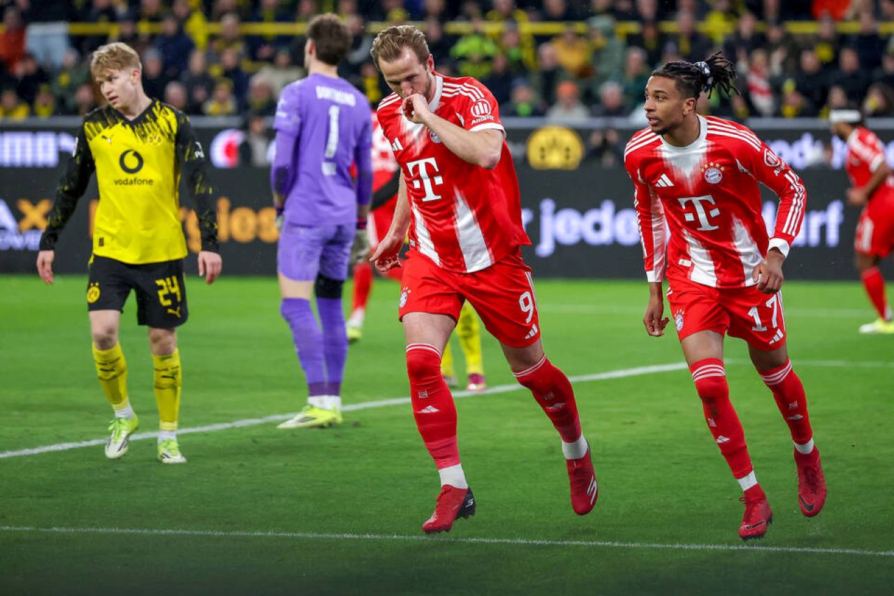 Selebrasi Harry Kane usai samakan kedudukan Bayern Munchen lawan Dortmund (1-1) dalam laga Bundesliga 2025/2026 pekan ke-24, Minggu 1 Maret 2026--IMAGO