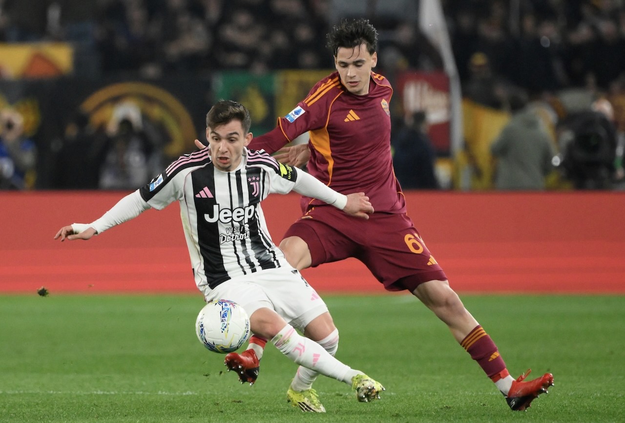 AS Roma vs Juventus 3-3: Gol telat Federico Gatti selamatkan Bianconeri. Foto: Pemain Juventus Francesco Conceicao berebut bola dengan Niccolo Pisilli.-Juventus Official-