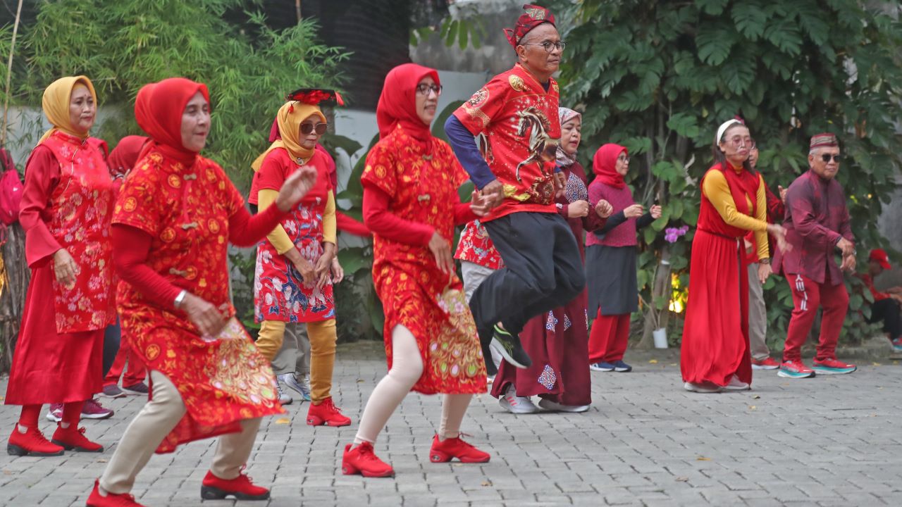 Musik bertempo cepat terdengar. Sekelompok orang dengan kostum merah-merah, luwes menggerakkan badan. Headpiece ala putri Tiongkok, cheongsam, penutup kepala dengan kepangan rambut panjang menyempurnakan penampilan mereka.