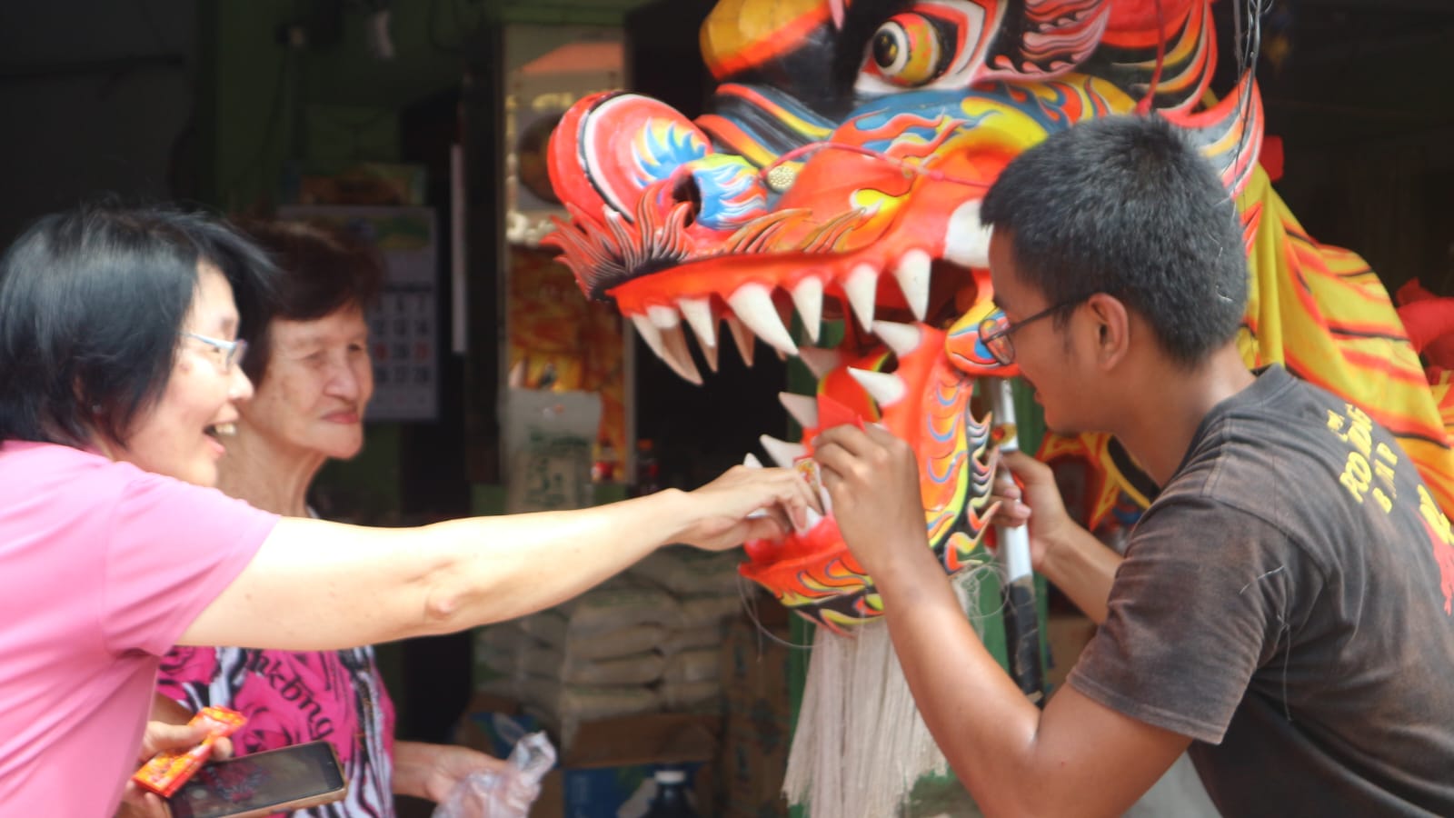 Salah seorang warga Blitar memberikan angpau pada liong-liong dalam Kirab Barongsai yang digelar Kelenteng Poo An Kiong, 3 Maret 2026.-Guruh D.N.-Harian Disway