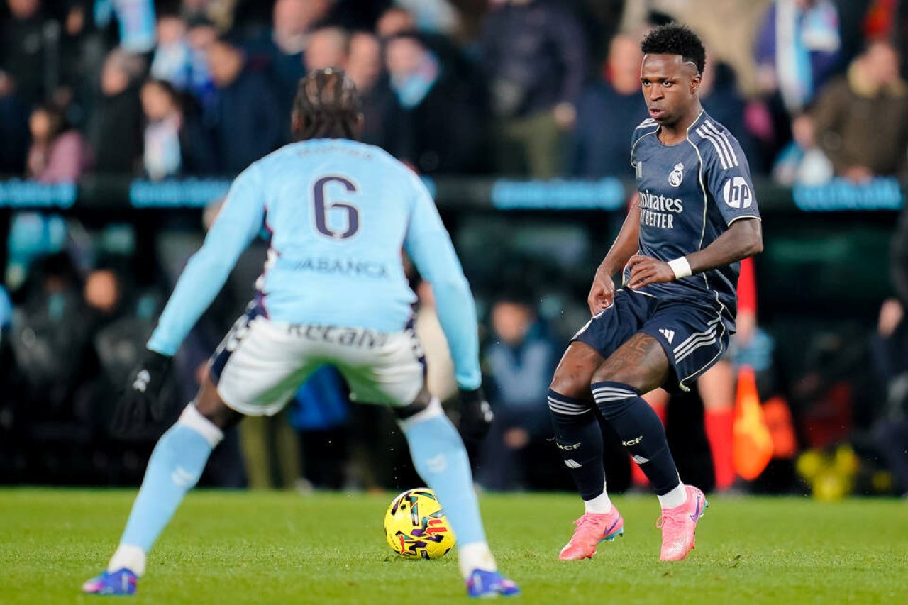 Aksi Vinicius Jr (kanan) dalam laga Celta Vigo vs Real Madrid, lanjutan La Liga 2025/2026 jornada ke-27, Sabtu 7 Maret 2026--IMAGO