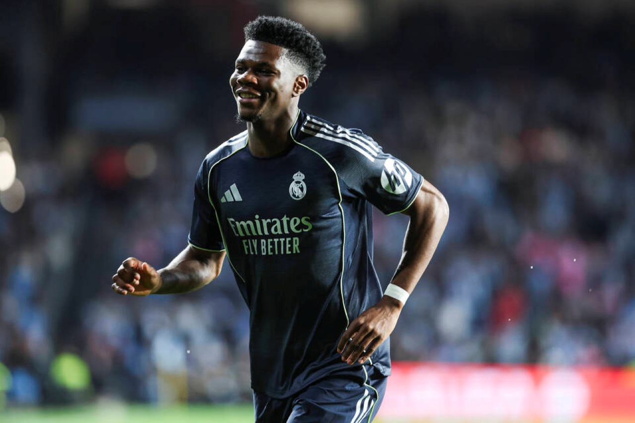 Selebrasi Aurelien Tchouameni usai buka keunggulan bagi Real Madrid atas Celta Vigo dalam laga La Liga 2025/2026 jornada ke-27, Sabtu 7 Maret 2026--IMAGO