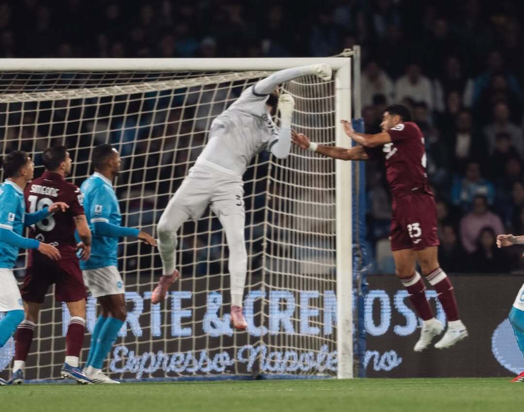 Momen kiper Napoli, Vanja Milinkovic-Savic, ketika melakukan penyelamatan krusial untuk menahan sundulan bek Torino, Saul Coco. Sabtu, 7 Maret 2026.--instagram @officialsscnapoli