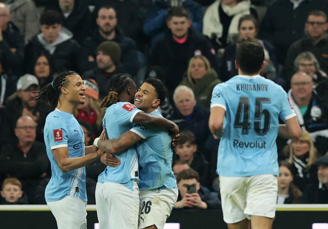 Selebrasi Savinho dkk usai samakan kedudukan Man City lawan Newcastle (1-1) dalam laga FA Cup 2025/2026 ronde ke-5, Minggu 8 Maret 2026-Scott Heppell-Reuters