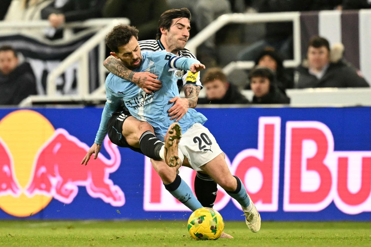 Duel Sandro Tonali dan Bernardo Silva dalam laga semifinal Carabao Cup leg pertama antara Newcastle United vs Man City, Rabu 14 Januari 2026-Oli Scarff-Getty Images