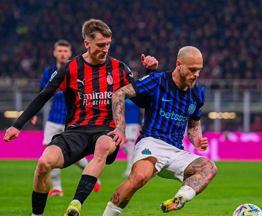 Aksi wing-back Inter Milan, Federico Dimarco (kanan), ketika berusaha menghindari kawalan winger AC Milan, Alexis Saelemaekers (kiri). Senin, 9 Maret 2026.--Instagram @acmilancast