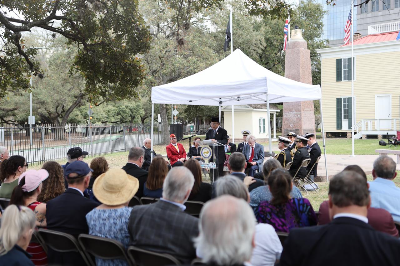 Kehidmatannya terasa semakin kuat karena tempat upacara itu sendiri membawa bobot sejarah yang besar. Di Sam Houston Park berdiri Monumen USS Houston, karya Jeff Ryan yang menjadi bagian dari taman itu sejak 1998. Di lokasi yang sama, terdapat lonceng kuningan kapal yang berhasil diangkat dari bangkai USS Houston, bertengger di atas pedestal granit yang memuat nama-nama awak kapal.