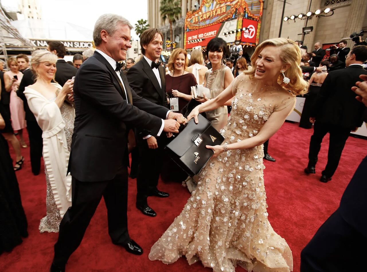Awal mula sistem amplop rahasia The Oscars. Foto: aktris Cate Blanchett bercanda hendak merebut koper amplop dari tangan akuntan PwC.-AFP-
