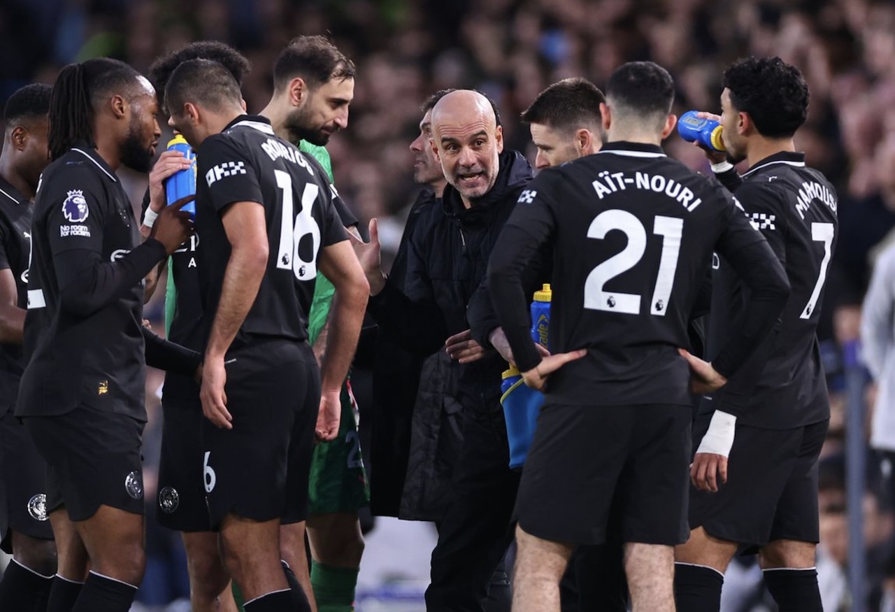 Leeds vs Man City 0-1, tanpa Haaland, Antoine Semenyo menangkan City. Foto: Pep Guardiola berbicara dengan anak buahnya pada saat break buka puasa di Elland Road, 1 Maret 2026.-Oli Scharff-AFP
