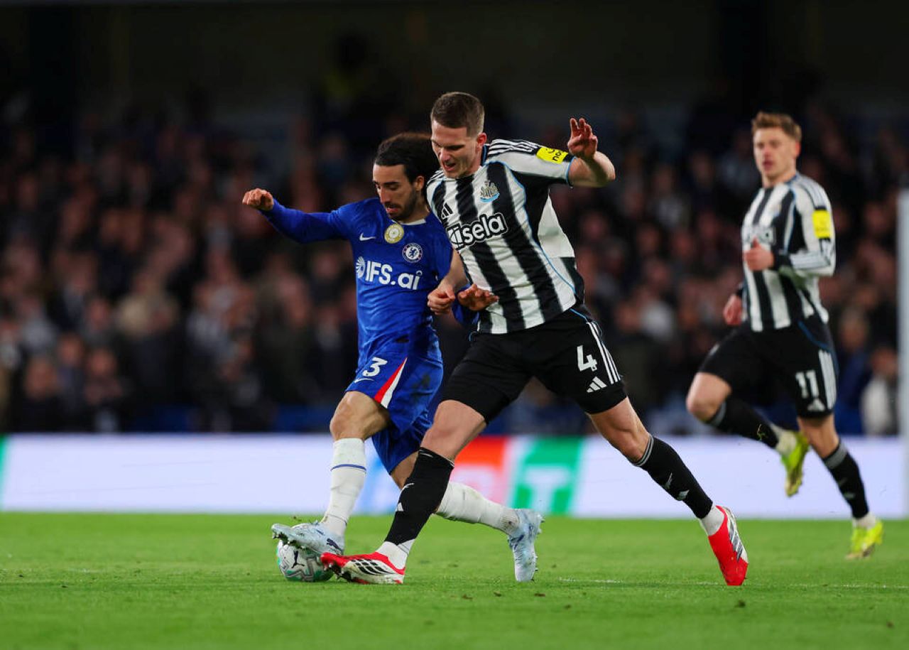 Duel Marc Cucurella (kiri) dan Sven Botman (kanan) dalam laga Chelsea vs Newcastle, laga Premier League 2025/2026 mathcday ke-30, Minggu 15 Maret 2026--IMAGO