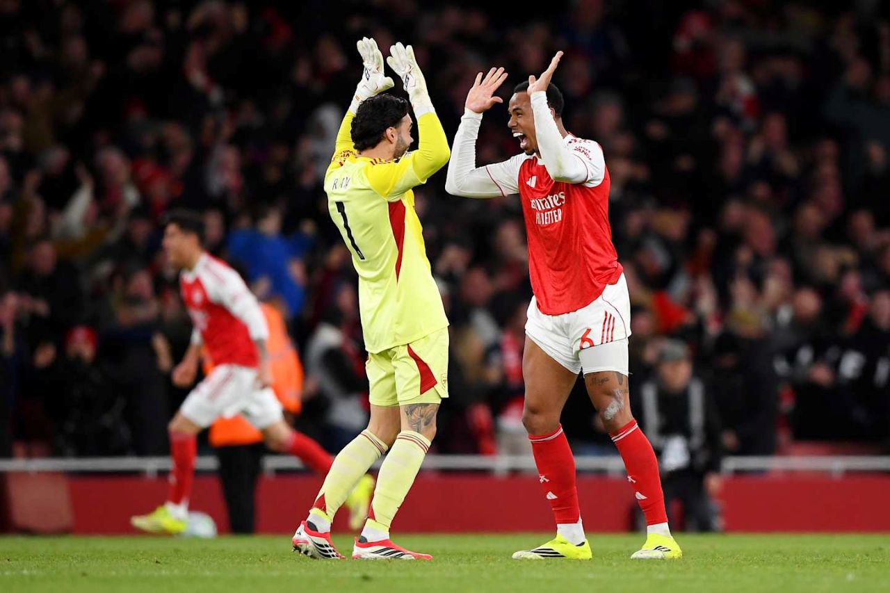 Momen David Raya (kiri) dan Gabriel Magalhaes (kanan) seusai Arsenal menang 2-0 atas Everton dalam laga lanjutan Premier League 2025/2026 matchday ke-30, Minggu 15 Maret 2026-Alex Burstow-Getty Images