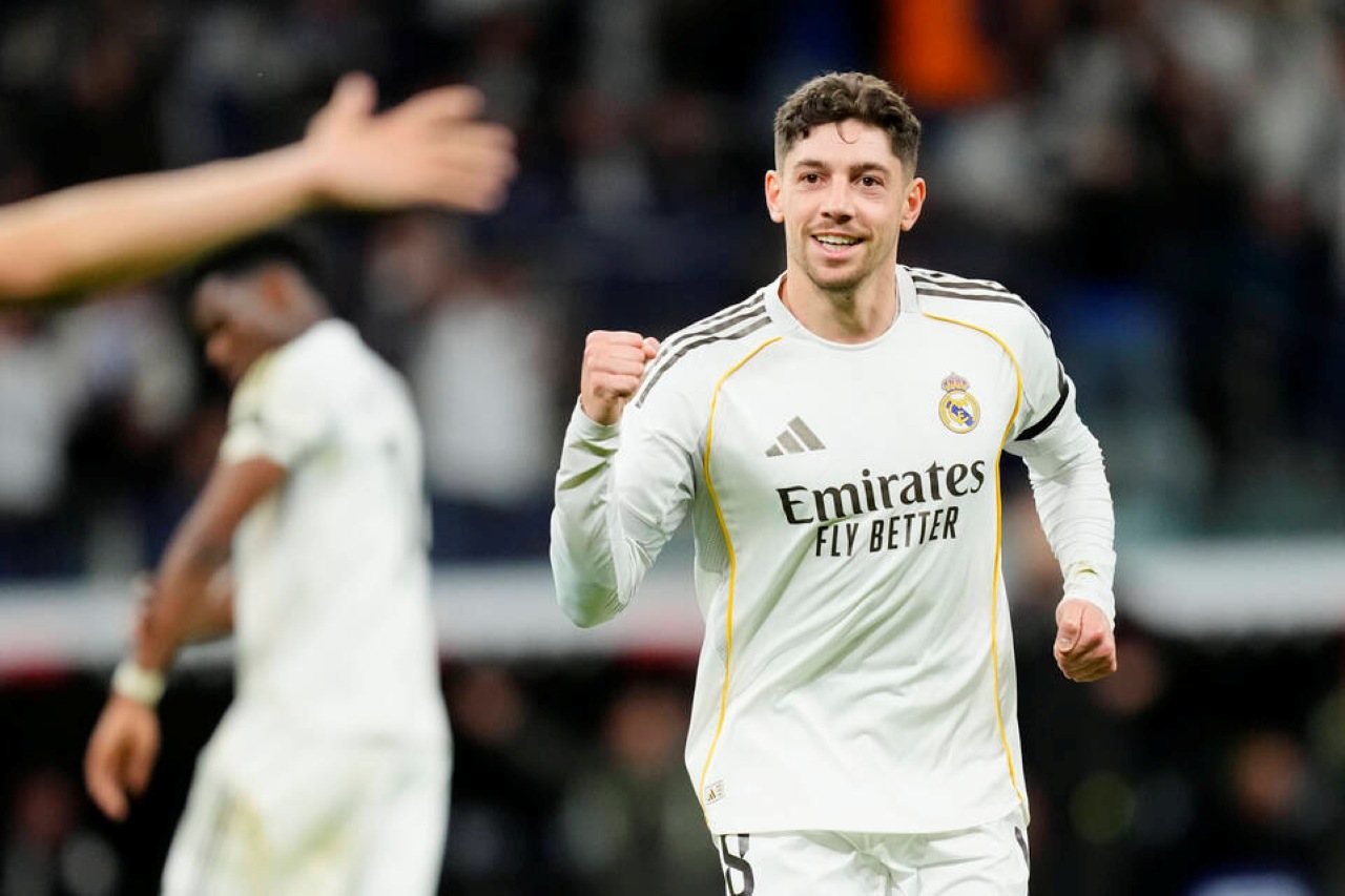 Selebrasi Fede Valverde usai gandakan keunggulan Real Madrid atas Elche dalam laga La Liga 2056/2026 jornada ke-28, Minggu 15 Maret 2026--IMAGO
