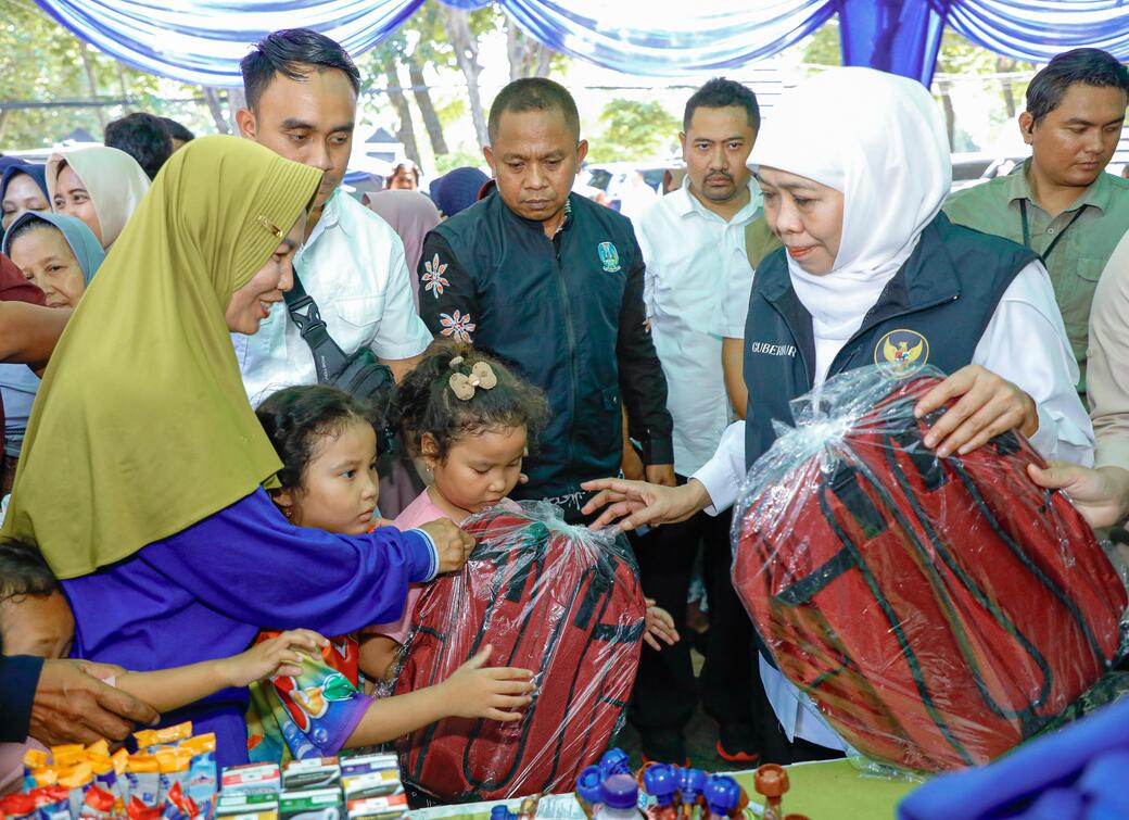 Khofifah menyerahkan bantuan tas kepada siswa di sekitar lokasi pasar murah-Humas Pemprov Jawa Timur -
