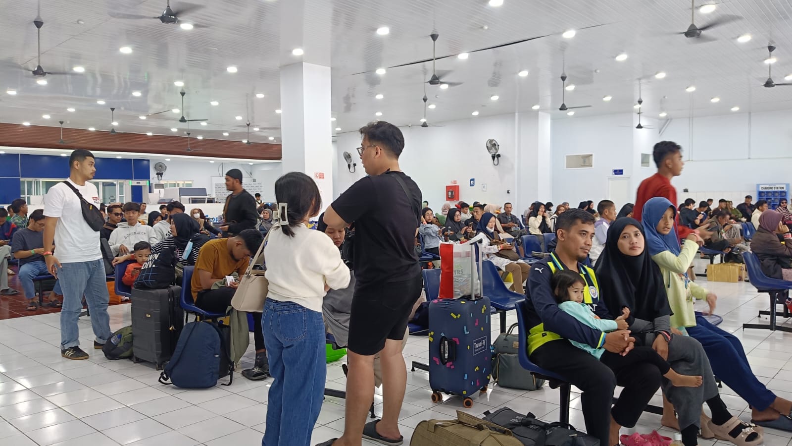 Beberapa pemudik terlihat duduk santai di ruang tunggu sambil menunggu jadwal keberangkatan kapal.