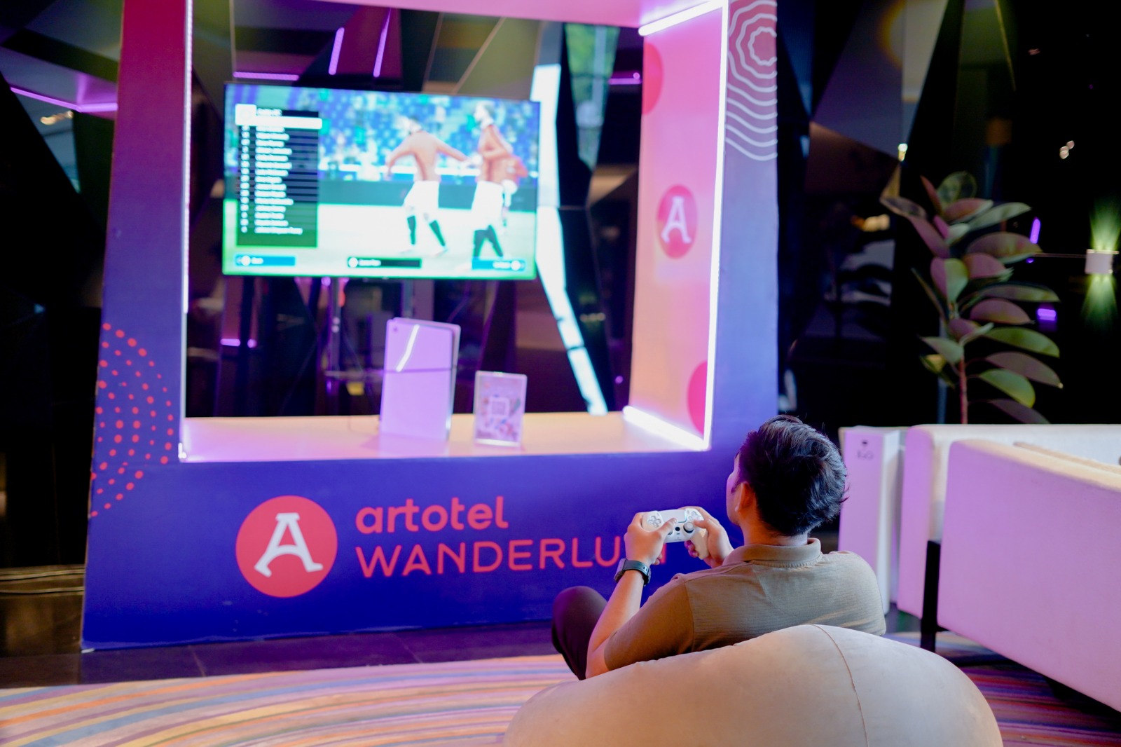 Playstation 5 yang terdapat di area lobi bisa dimainkan gratis.-ARTOTEL TS Suites Surabaya-