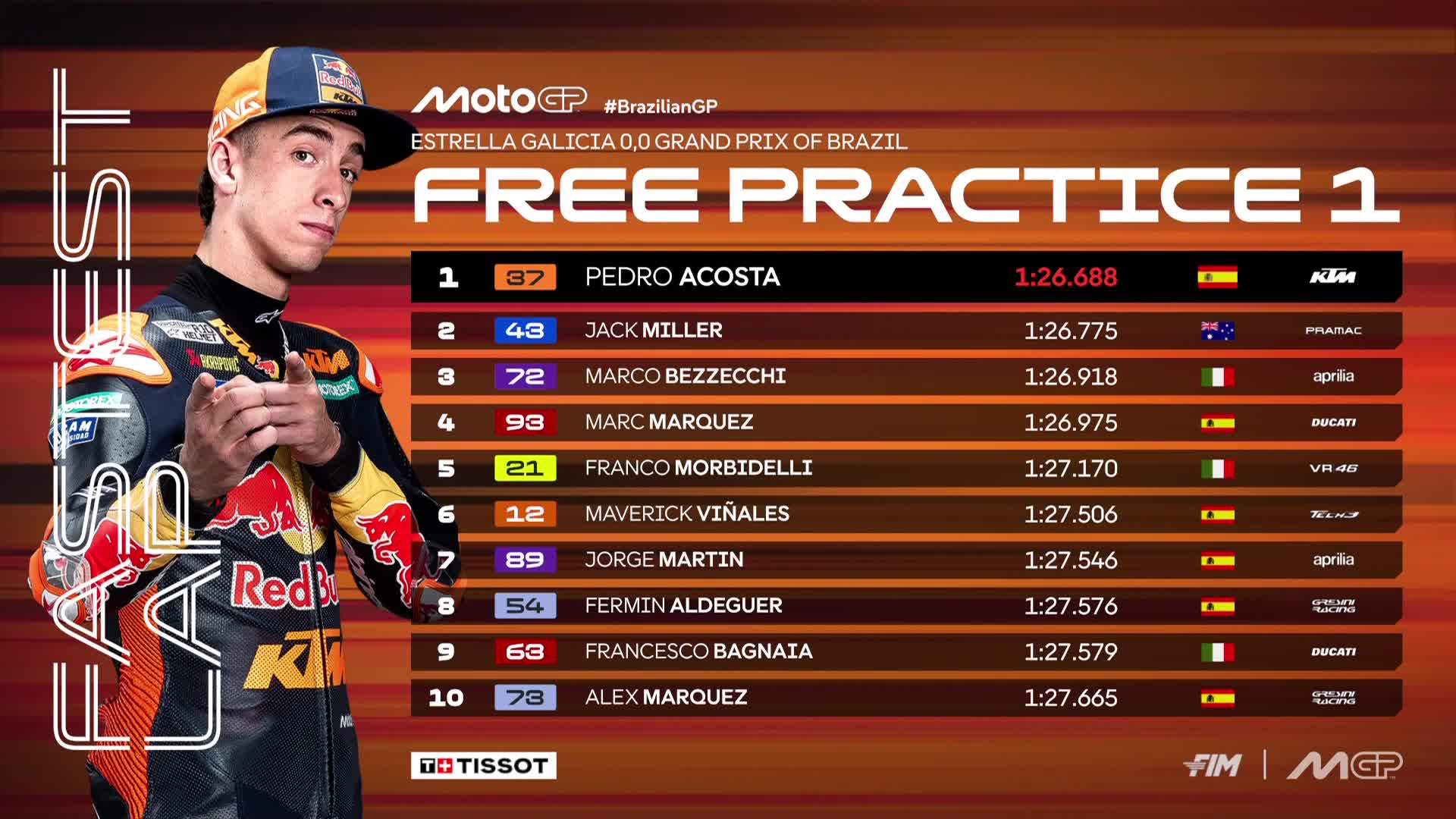 Daftar 10 pembalap tercepat MotoGP di FP1 GP Brasil 2026, pada 20 Maret 2026--Twitter MotoGP @MotoGP
