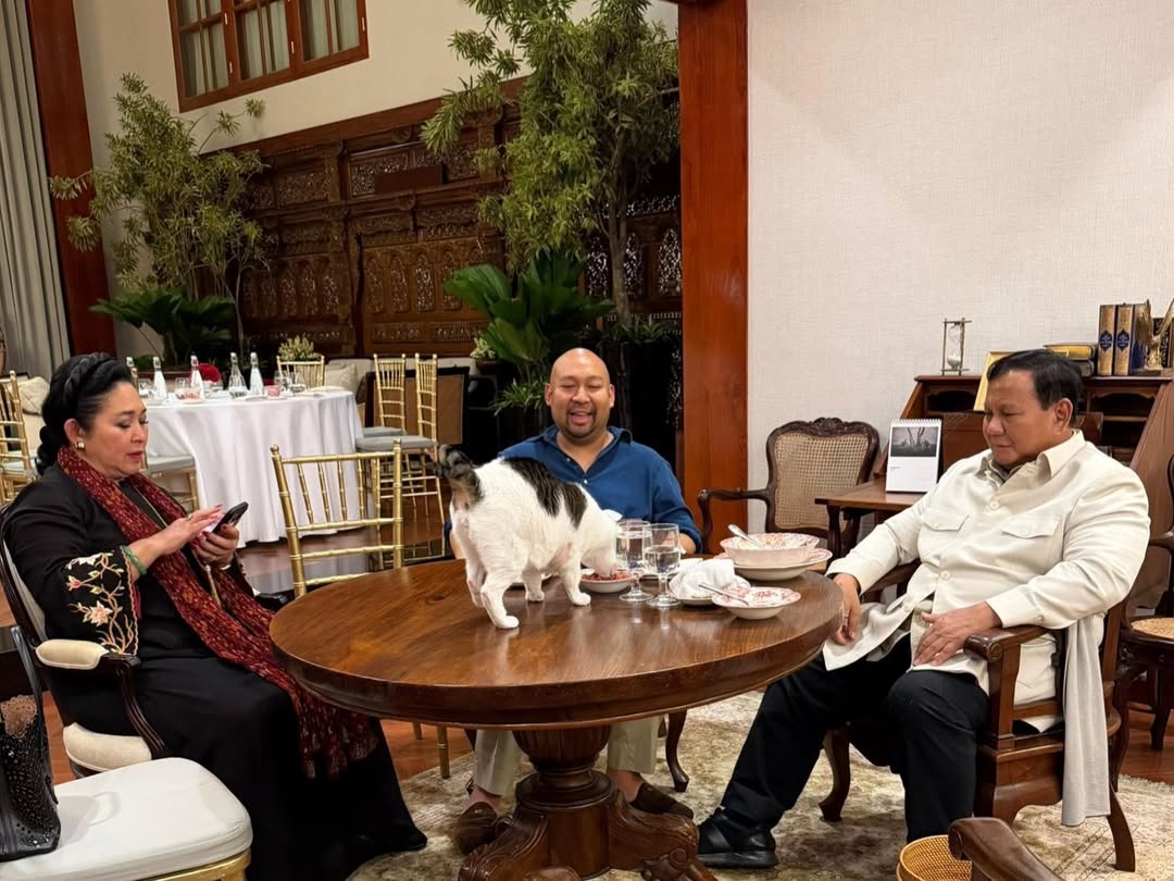 Dan tak ketinggalan ada Bobby Kertanegara, kucing peliharaan Prabowo, ikut menemani. Di sejumlah foto yang diunggah, tampak Bobby melenggang di atas meja makan sambil ikut mencicipi makanan di atas meja. Ketiganya tampak menikmati tingkah Bobby di atas meja.