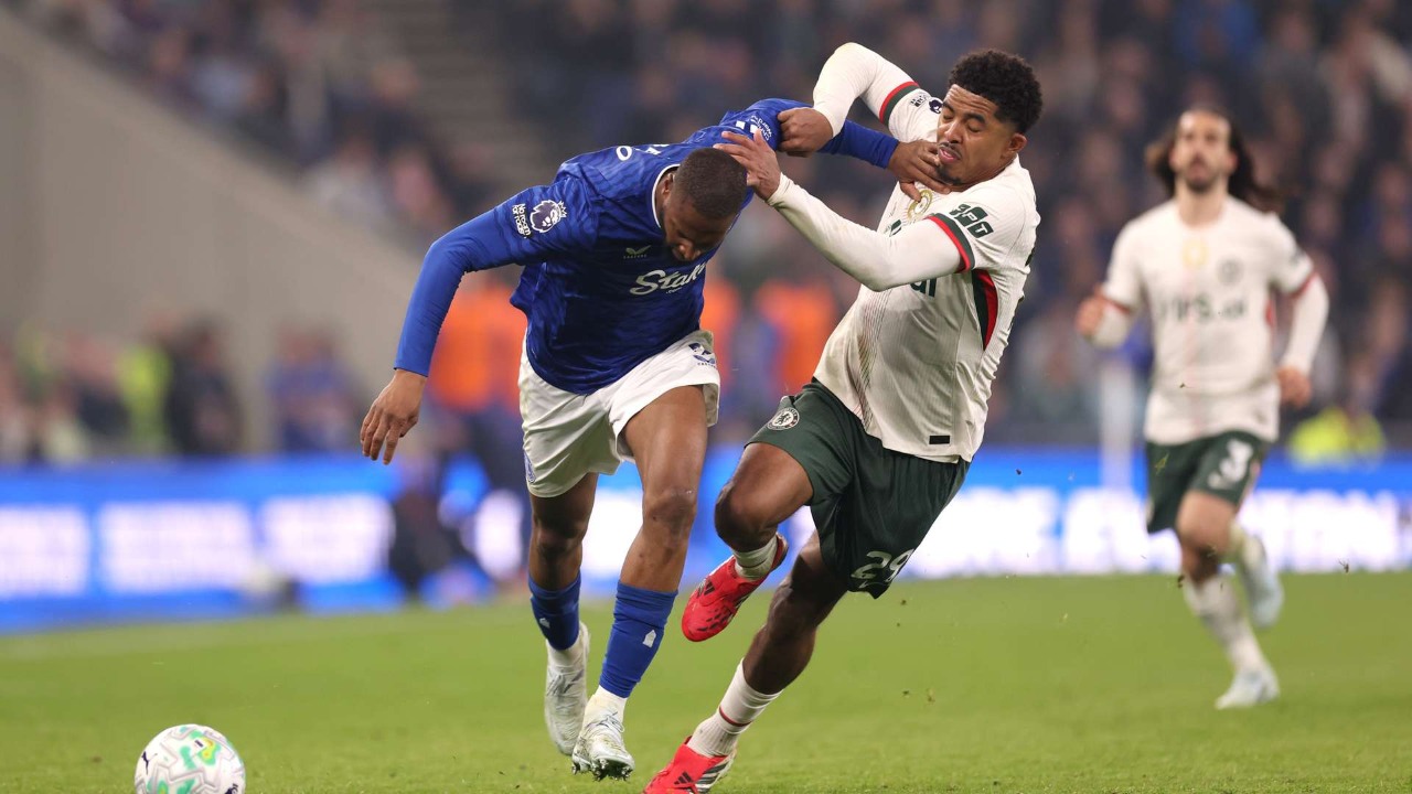 Duel Beto (kiri) dan Wesley Fofana (kanan) dalam laga Everton vs Chelsea, lanjutan Premier League 2025/2026 matchday ke-31, Minggu 22 Maret 2026--Getty Images