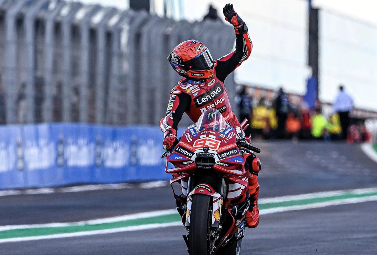 Start dari tempat ketiga di belakang Di Giannantonio (VR46) dan Marco Bezzecchi (Aprilia), bintang Ducati itu berhasil merangsek ke depan. Menyalip Bezzecchi, dan menekan Diggia (panggilan Di Giannantonio) sepanjang lomba.