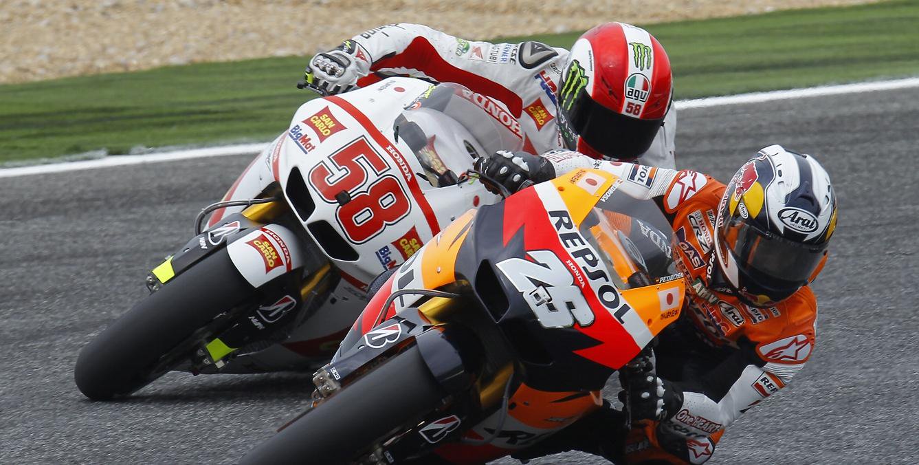 Pembalap Gresini Racing Marco Simoncelli (58) dan pembalap Repsol Honda, Dani Pedrosa (26), saat keduanya bertarung di GP Portugal 2011. Bahwa hubungan Gresini Racing dan Honda sudah pernah terjalin cukup lama. --Twitter Zdravko @Zdravkost