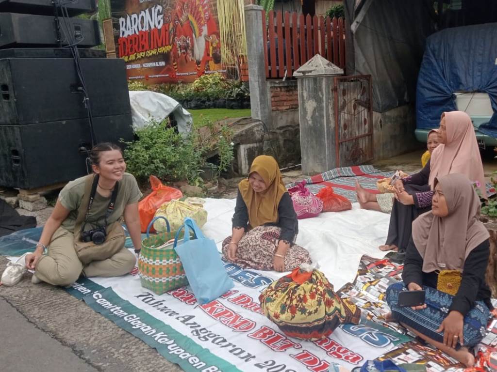 FIFIN MAIDARINA (kiri) berbincang dengan ibu-ibu sebelum ritual dimulai. Mereka membawa makanan untuk disantap bersama seusai arak-arakan.--Fifin Maidarina untuk Harian Disway