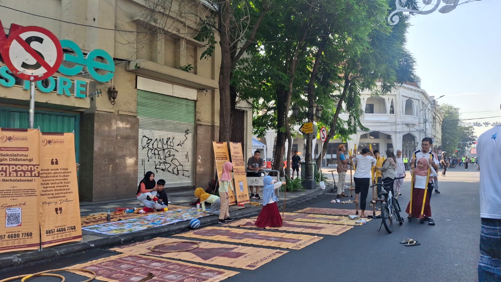 Beragam aktivitas dilakukan di Jalan Tunjungan sejak pagi buta. Sebagian besar berolahraga, tapi ada juga yang memanfaatkan momen itu untuk campaign. Seperti yang dilakukan komunitas Kampoeng Dolanan.