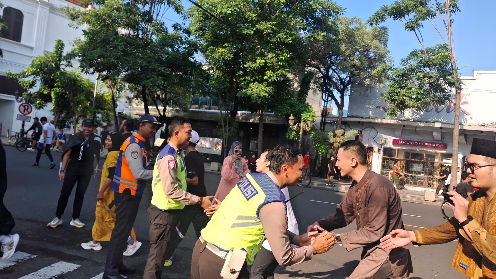 PARA PELARI bersalaman dengan petugas Dishub dan polisi yang bertugas di CFD Tunjungan pada Minggu, 29 Maret 2026.-Rossa Handini-Harian Disway