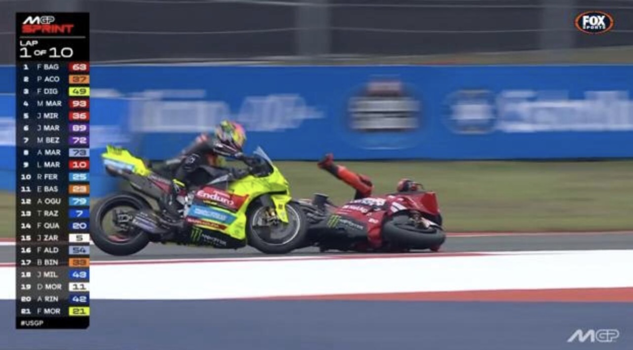 MotoGP AS 2026: Marc Marquez kena penalti, sebut Diggia pantas marah. Foto: Marc Marquez terjatuh lebih dulu ketika sedang menyalip Di Giannantonio saat Sprint Race, 29 Maret 2026. -FOX-
