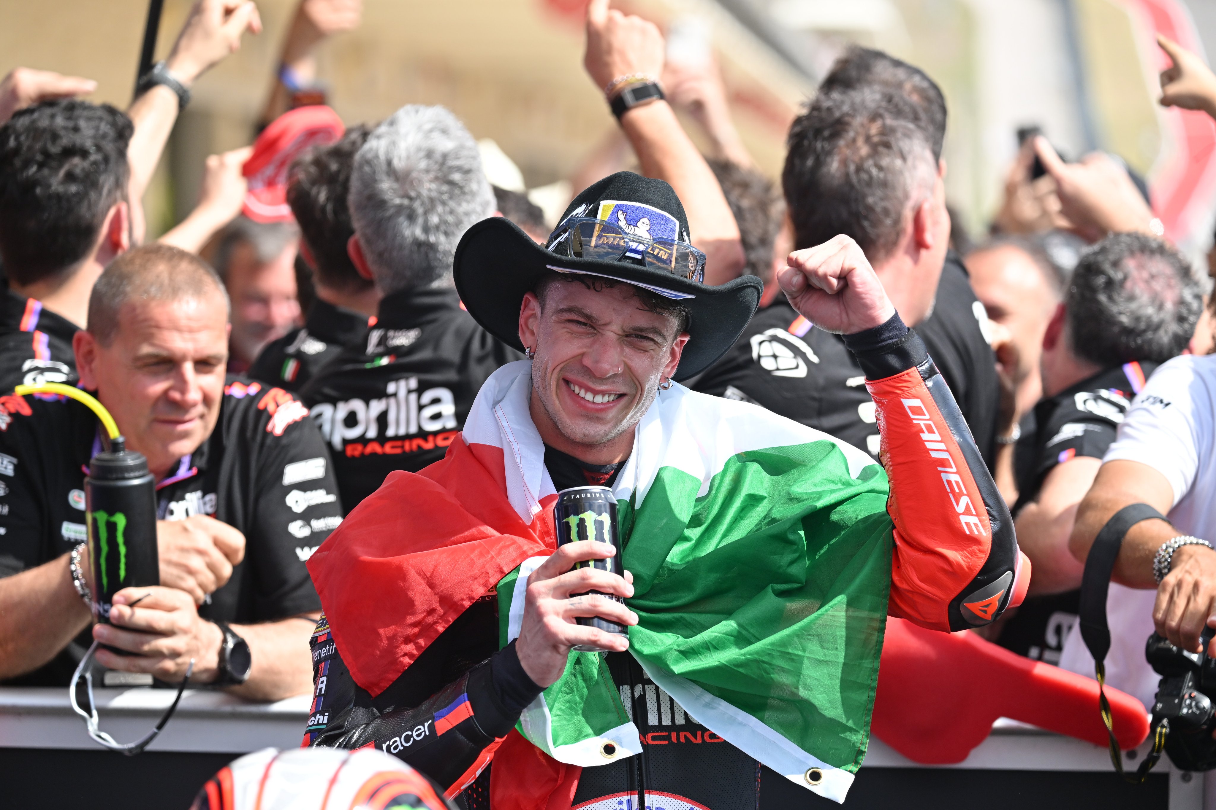 Marco Bezzecchi, saat merayakan kemenangannya bersama kru Aprilia di GP Amerika Serikat 2026, pada 29 Maret 2026--Twitter Michelin Motorsport @Michelin_Sport