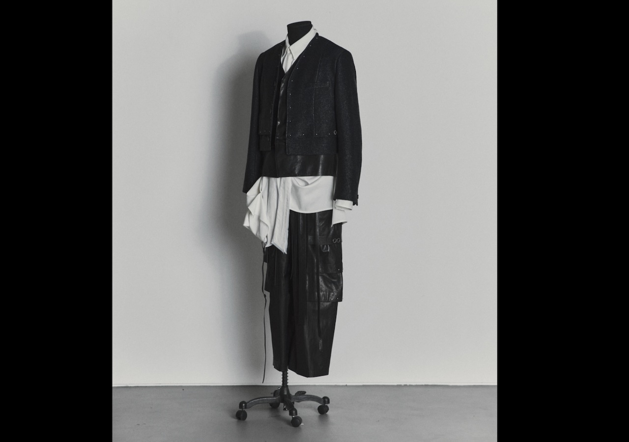 Kemeja berkerah tinggi asimetris yang dilapisi seperti baju zirah kuno mengekspresikan kekuatan dan keanggunannya. Sebaliknya, celana panjangnya menampilkan desain yang dipotong tajam, menggambarkan bekas luka pertempuran sengit.