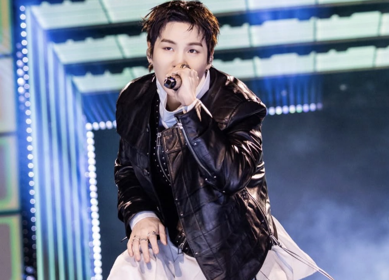 Makna kostum BTS di konser comeback ARIRANG karya Songzio, armor yang super stylish. Foto: Suga BTS mendapatkan peran sebagai arsitek di konser comeback, 21 Maret 2026.-Getty Images via AFP-