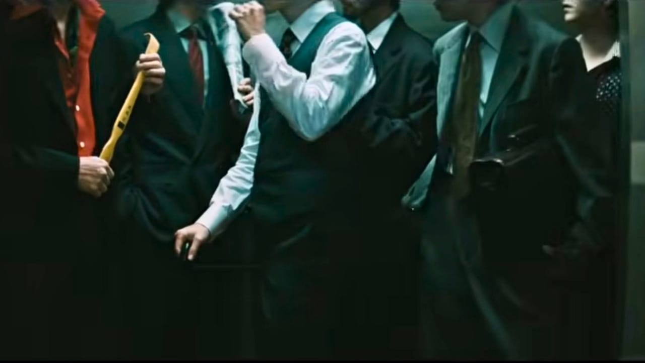 Adegan dibuka di sebuah lorong tua yang remang-remang, penuh pria berwajah sangar. Ketegangan memuncak ketika pintu lift di lantai dua terbuka. Tampaklah enam pria dalam balutan jas rapi bak komplotan mafia elite yang kontras dengan situasi lorong.