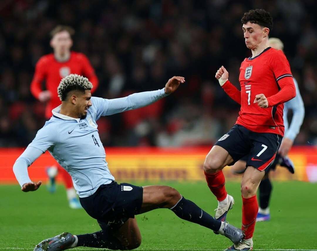 Momen bek Uruguay, Ronald Araujo (kiri), ketika melakukan tekel keras terhadap gelandang Inggris, Phil Foden (kanan). Sabtu, 28 Maret 2026.--Instagram @planetfootballcom