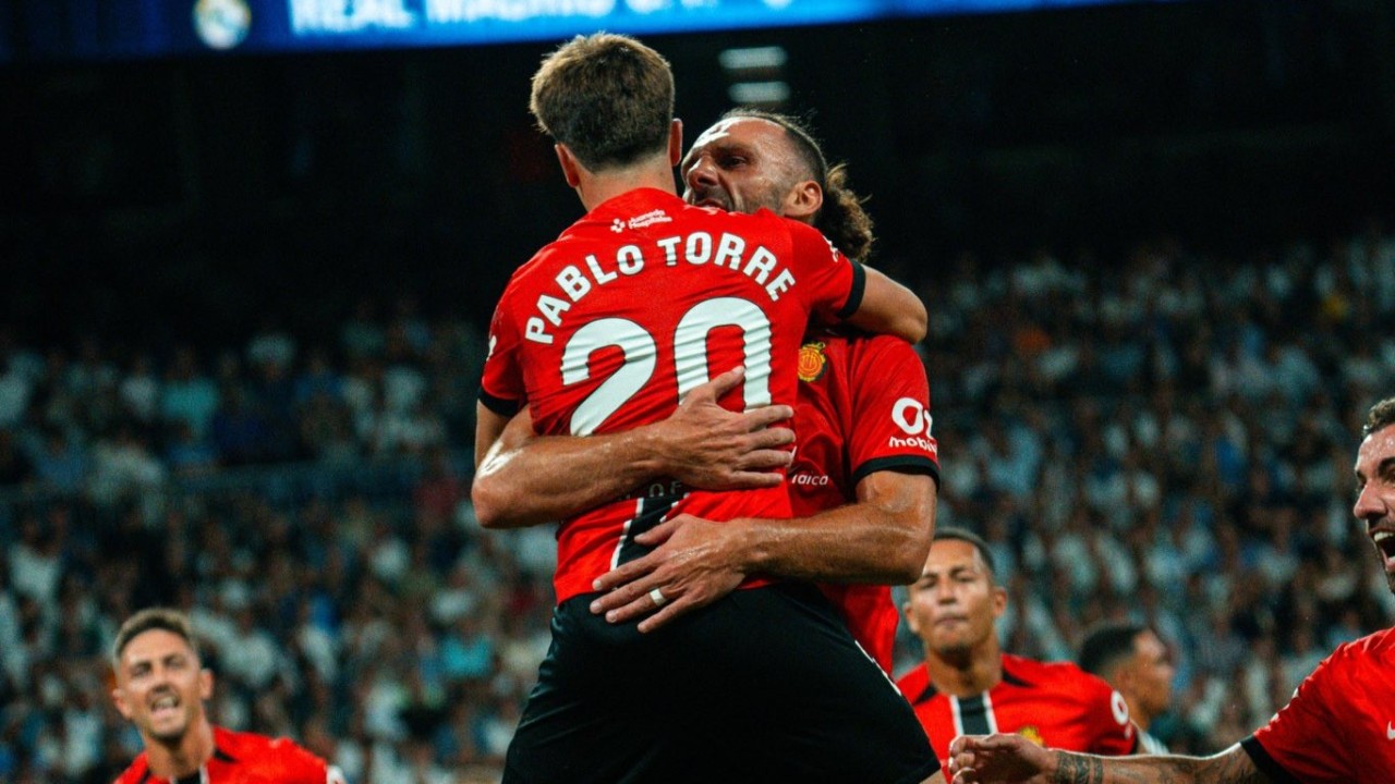 Pablo Torre dan Vedat Muriqi berpelukan setelah mencetak gol pertama untuk Mallorca saat melawan Real Madrid di pertandingan lanjutan La Liga 2025/2026 pada 31 Agustus 2025-@RCD_Mallorca-X