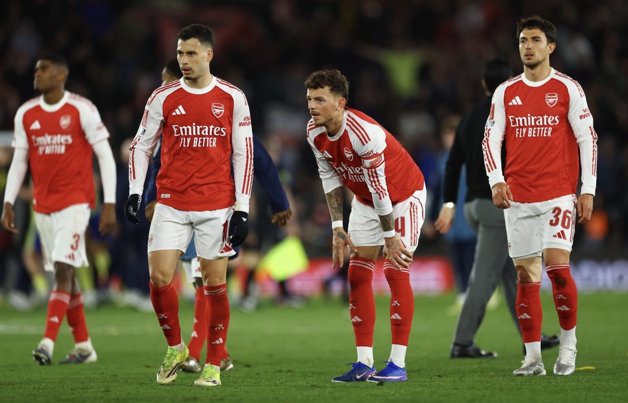 Southampton vs Arsenal 2-1, mimpi treble The Gunners resmi pupus. Foto: para pemain Arsenal tak percaya dengan hasil akhir pertandingan di kandang Southampton, 5 April 2026.-PA Wire-